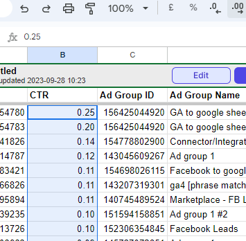 In our case 0.25 = 2.5%. You can now add filters, and conditional formatting to partially analyze the correlation between the ad copies and the CTR. You can also filter this report by clicking on the Edit button in the helpbar.