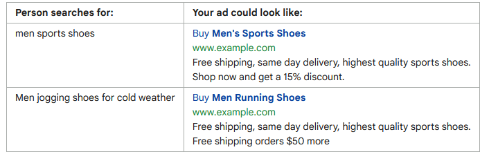 The search term the person is looking for is not always the same as the keyword. In the first example below, Google will replace Men Running Shoes with Men Sports Shoes, if the user has searched for men sports shoes. This makes the ad more relevant to the person’s search.