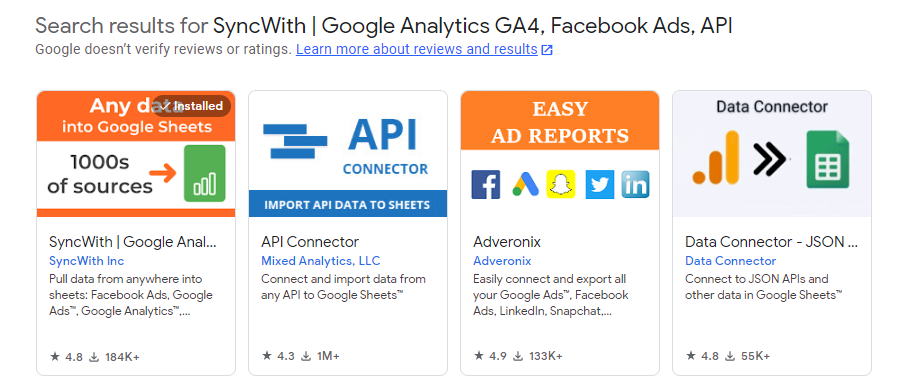 To export your ad copies, install SyncWith by opening up a Google Sheets document, going to Extensions > Add-ons > Get add-ons, and installing the first one - SyncWith | Google Analytics GA4, Facebook Ads, API. It’s free to use and easy to set up in 2-3 minutes.