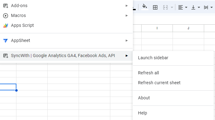 Once you do that, you can launch the sidebar by going to Extensions > SyncWith | Google Analytics GA4, Facebook Ads, API > Launch sidebar