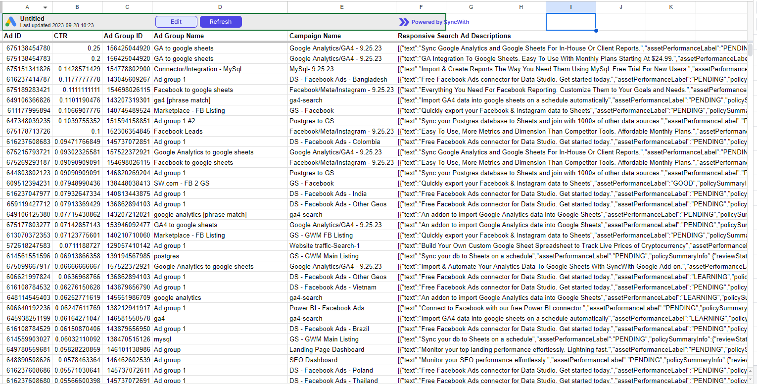 This will give you an eagle-eye view of all your ads. You can format the CTR field to present the information comprehensively. This will export all ad info in one cell, and it’s very easy to work with. Don’t worry, when the report gets refreshed, it will be presented in the newly formatted way.
